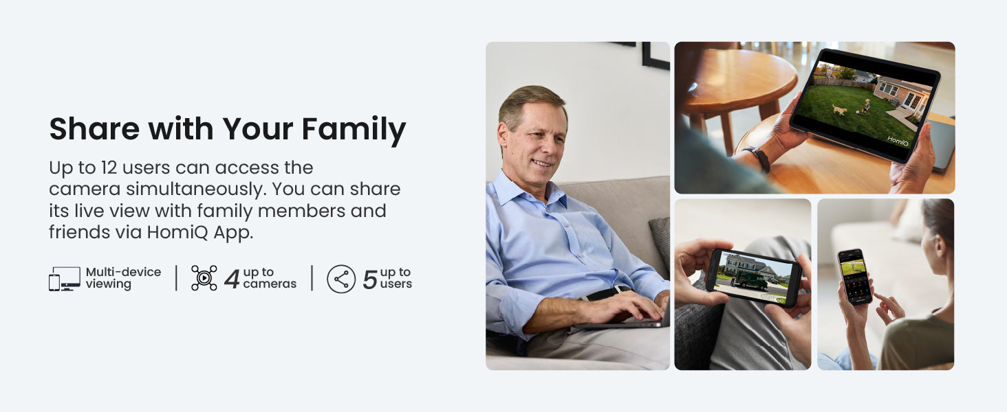 Monitor your home anytime, anywhere. The HomiQ Life app supports up to four camera feeds and allows you to easily share access with family, making remote monitoring a breeze.